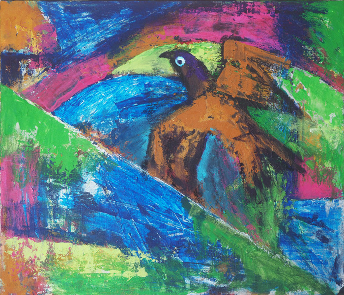 「妖かし」シリーズとして連作している冬バージョンの新作です。里の地にはモグラのごときが闊歩しており、空を眺めれば其処には優雅に舞う鳥類が怜悧な存在感を見せ付けているのです。人間業とはかけ離れた、いわば霊気に導かれるようなパフォーマンスと云ってよい。